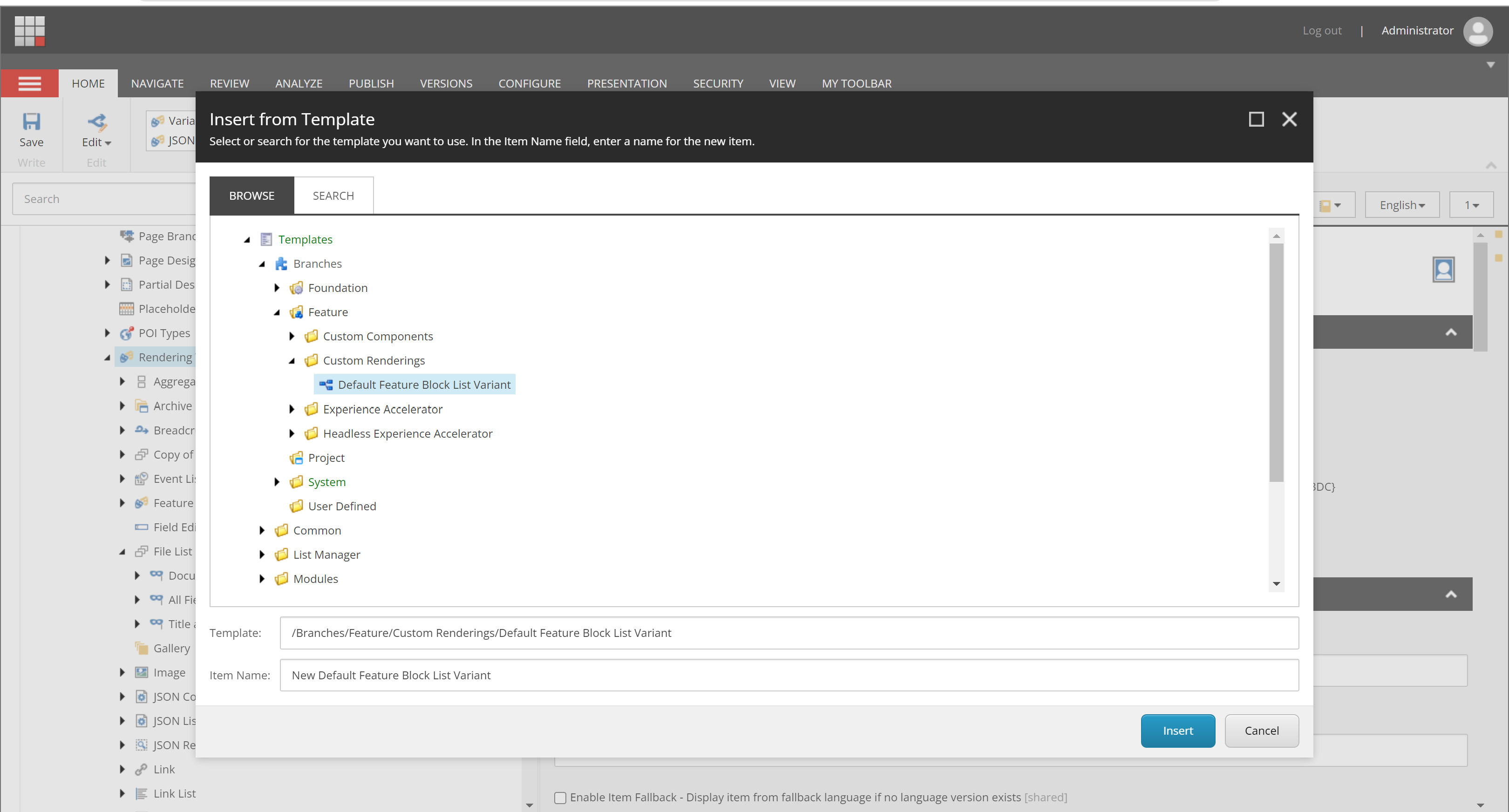 8. Similarly, under /sitecore/content/<tenant>/<site>/Presentation/Rendering Variants, add Variants named Feature Block List